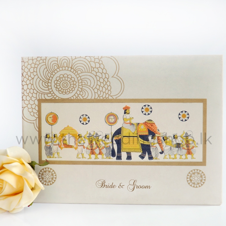 Hard cover. Embossed Kandyan perahera with colour printing on pearl paper. Ideal for Kandyan or Modern Kandyan Weddings. Design can be customized in the colours of your choice (Please contact sales@theweddingshop.lk for colour choices before buying).